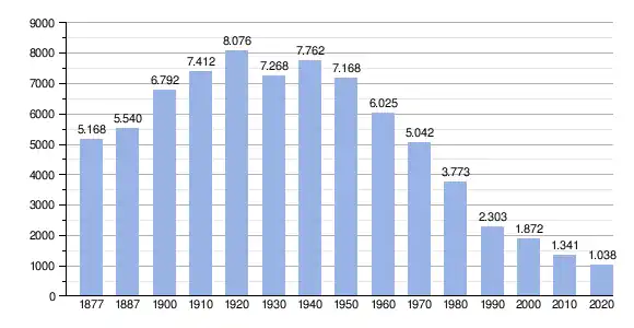 Nach Höhepunkten der Gemeindegröße zu Beginn des Betrachtungszeitraums und zu Beginn des 20. Jahrhunderts auf über 7000 Einwohner sank die Zahl der Bevölkerung im Anschluss stetig bis auf circa 1000. Die markantesten Rückgänge sind zwischen 1860 und 1877 und zwischen 1981 und 1991 zu verzeichnen, als die Gemeinde in diesen Perioden allein circa 28 % bzw. circa 43 % der Einwohner verlor.