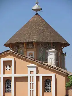 Die Anlage nimmt den westeuropäischen Typ der Doppelturmfassade auf, zerlegt ihn jedoch in drei Bauteile: Die Mitte bildet der kubische, massive Block des Kirchenschiffs, der von zwei freistehenden Kirchtürmen flankiert wird. Als oberer Abschluss der Türme dienen Pavillons, die klassischen afrikanischen Rundhütten, Tukuls, nachgebildet sind. Zwischen beiden Türmen führt eine Treppe auf eine Plattform, auf der das Kirchenschiff steht, in das zwei Türen führen. Das äußere Erscheinungsbild von Schiff und Türmen wird durch sich abwechselnde Lagen von Bruch- und Backsteinen geprägt. Damit sollen aksumitische Architekturelemente aufgenommen worden sein. An der Westfassade, über dem Eingang, wurden 1938 sieben hochformatige monumentale Mosaike, die religiöse Szenen darstellen, ergänzt. Darüber befinden sich sieben aksumitische Kreuze.