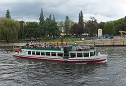 05612560 1988 Länge: 25 m; Breite: 4,5 m. Das Schiff wurde auf der KuFra-Werft in Lübeck gebaut und zunächst von der US-Armee in Berlin-Wannsee genutzt. 1994 wurde es auf der Werft Malz modernisiert. Von 1994 an gehörte es zur Flotte der Dahme-Schiffahrt [sic!] Teupitz und hieß Liberty, 1999 kam es nach Lindau (Bodensee) und 2003 nach Bad Cannstatt. 2005 wurde es von 18 auf 25 Meter verlängert. Seit 2018 ist das Schiff auf dem Traunsee im Einsatz.[15]