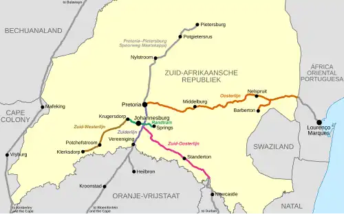Noch im gleichen Jahr begannen der Oberingenieur R.A.I. Snethlage mit den Vermessungsarbeiten von Komatipoort aus, aber Malaria und Streitigkeiten mit Portugal verzögerten die Bauarbeiten. Die NZASM begann deshalb den Bau der Bahnstrecke Johannesburg–Boksburg, welche am 17. März 1890 den Betrieb aufnahm und unter dem Namen Rand Tram bekannt war. Sie diente dem Kohlentransport von Boksburg zu den Witwatersrand-Goldgruben südlich von Johannesburg, aber auch dem Transport der Bergleute. Die Strecke wurde bereits im Oktober 1890 von Boksburg nach Springs verlängert und im Februar 1891 von Johannesburg über Roodepoort nach Krugersdorp. Die ursprünglich mit leichtem Oberbau angelegte Strecke wurde ab 1892 mit normalem Oberbau versehen und mit der im gleichen Jahr fertiggestellten Brücke über den Vaal bei Vereeniging mit dem Eisenbahnnetz des Oranje-Freistaates verbunden.[1]