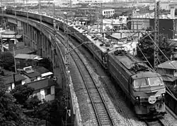 Der Abschnitt nördlich des Bahnhofs Sakuragichō ist Teil der ältesten Bahnstrecke Japans, die Yokohama mit Tokio verband. Er wurde am 12. Juni 1872 provisorisch eröffnet, am 14. Oktober desselben Jahres auch offiziell. Die Aufnahme des Güterverkehrs erfolgte knapp elf Monate später am 15. September 1873.[5] Sakuragichō war über vier Jahrzehnte lang der Hauptbahnhof der Stadt und fast alle Personenzüge der Tōkaidō-Hauptlinie hielten hier. Zur Vermeidung des Kopfbahnhofs bestand seit 1898 eine Abkürzungsstrecke nach Hodogaya. An dieser entstand 1915 der Bahnhof Yokohama (beim heutigen U-Bahnhof Takashimachō), der aber bereits acht Jahre später beim Großen Kantō-Erdbeben zerstört wurde. 1928 ersetzte man ihn durch einen etwas weiter nördlich gelegenen Neubau.[6]