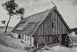 Traditionelle Bauern- und Fischerhäuser waren in Ostpreußen selten Lehmfachwerkhäuser, sondern wurden meistens in Holzbauweise errichtet, teilweise in der in Ost- und Ostmitteleuropa häufigen Blockbauweise, öfter aber besonders in Küstennähe in Ständerbohlenbauweise, die auch in Skandinavien und im Baltikum häufig ist, in beiden Fällen meistens innen verputzt. Die Dächer sind Reetdächer. Der First wurde mit stilisierten gekreuzten Hengstköpfen (nehrungskurisch und lettisch: zirgs = ‚Pferd‘) oder mit anderem Firstpunkt- und Giebelschmuck verziert, an denen Symbole, wie Anker, Vögel, Herzen, Pflanzenranken und teilweise alten Symboliken, wie Sonnensymbole ergänzt wurden.