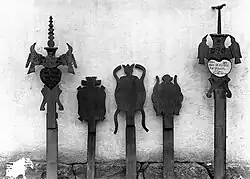- ↑ Abriss der langen Forschungsdiskussion aus: Krikštas in: Senoji Lietuvių Skulptūriu, Kryžiai ir Koplytėlės. (litauisch, =‚Alte litauische Skulpturen, Kreuze und Schreine.‘), ursprünglich Lexikonartikel der Lietuvių enciklopedijos Bd. XIII, S. 118–119, Boston 1958 ff. (oben die älteren Theorien, unten der Widerspruch von Balys); sowie: diese Forschungswiedergabe auf Senoji Lietuvių Skulptūriu, Kryžiai ir Koplytėlės., ein Auszug aus: Česlovas Kontrimas: Lietuvos geležiniai kryžiai. (= Litauische Eisenkreuze) Vilnius 1991, S. 7–13 (oben ältere Theorien, daneben auch zu katholisch-litauischen Grabkreuzen und Kruzifixen, unten Neubewertungen von Galaunė und Grinius).