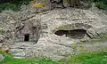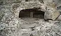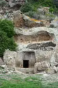 Die glatten Frontseiten der Nekropole sind aus dem Fels gehauen und gegenüber den kleinen Zugängen und einigen fensterartigen Öffnungen riesenhaft. Die fast immer mit Vorräumen oder Dromoi versehenen Anlagen sind ein- oder doppelzellig. Eckige Formen von Zugängen und Räumen wechseln mit ovalen und gekurvten Grundrissen, die auf das Sulki beschränkt sind. Einige der in dem weiten, vom Rio Palmas durchflossenen Talkessel liegenden Anlagen haben symbolisch-dekorative Bemalungen und die typischen eindrucksvollen Verzierungen aus geometrischen Motiven Scheintüren und konzentrischen Kreisen und Stiergehörnen. In manchen der heute oben offenen Kammern sammelt sich das Regenwasser.