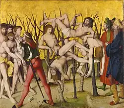 Beim Martyrium der Zehntausend ist ersichtlich, dass sich in der zeichnerischen Anlage und der Farbigkeit, dessen Kolorit ins Tiefe und Weiche gehen, die gleiche Hand wie in der Enthauptung eines jungen Heiligen findet. Zudem finden sich ähnliche Motive und Figurentypen, die der Künstler in verschiedenen Gemälden mehrfach verwendet hat, wie beispielsweise der orientalische Turbanträger und Herrschergestalten oder der Henker, der in einem ähnlichen Schrittmotiv dargestellt ist wie im Gemälde des jungen Heiligen. Auch seine Kleidung (pantoffelartige Schuhe mit heller Bordüre, eng anliegende Hose, geschlitztes Wams) und selbst das Schwert und die Schwertscheide sind fast identisch. Das gilt auch für das Szepter des Herrschers am rechten Bildrand. Und wie im Bild des jungen Heiligen rückt der Künstler auch in diesem Bild das Gemetzel in ein west-östliches Spannungsfeld jener Zeit. Obwohl es sich um den römischen Kaiser Hadrian handeln müsste, sind er und sein Gefolge orientalisch gekleidet: auf der einen Seite die „recht-gläubigen“ Märtyrer, auf der andern Seite die „Ungläubigen“ aus dem Orient, die das Abendland bedrohen. Der Gruppe des Befehlshabers steht links die Gruppe der Gefangenen gegenüber, die ebenfalls dicht an den Bildrand gesetzt sind. Hier zeigt sich, dass der erste Zürcher Nelkenmeister gern nach einem ähnlichen Kompositionsprinzip arbeitete: Das Hauptmotiv ist von eng beisammenstehenden Figuren, die am Bildrand stehen, gerahmt. Der Legende nach soll das Martyrium der zehntausend Christen unter der Herrschaft der Kaiser Hadrian und Antoninus Pius am Berg Ararat stattgefunden haben. Ein römisches Heer war unter der Führung des heidnischen Fürsten Achatius nach Kleinasien gezogen. Angesicht einer drohenden Niederlage aufgrund einer beträchtichen feindlichen Übermacht sollen den römischen Truppen Engel erschienen sein, die ihnen verhiessen, dass sie, falls sie zu Christus beteten, den Sieg davontragen würden. Nach gewonnener Schlacht erfuhr der römische Kaiser von der Bekehrung der römischen Soldaten. Er schickte den Abtrünnigen seinerseits eine Barbaren-Armee entgegen. Darauf folgte das Martyrium der Ritter, was dazu führte, dass weitere 1000 Heiden sich zum Christentum bekannten und zu den christlichen Truppen überliefen. So kam es, dass der Legende nach zehntausend Christen – je nach Überlieferung – in verschiedenen Formen und Reihenfolge gesteinigt, gegeisselt, mit Dornen bekrönt, ans Kreuz geschlagen und schliesslich vom Berg in ein Dornengestrüpp gestossen wurden. Einige Folter- und Tötungsformen betonen bereits den Aspekt der imitatio Christi, der Nachfolge Jesu. Die Legende verbreitete sich seit dem 12. Jahrhundert. Als historischer Hintergrund dürften die Kreuzzüge gelten. Die Ritter sollten in der Darstellung des Martyriums der Zehntausend ein Vorbild finden. Aus dieser Perspektive ist verständlich, dass die Heiden im Zürcher Bild als Orientalen dargestellt sind. Sie nimmt Anleihen aus der anderen bekannten, deutlich älteren Legende auf, dem Martyrium der Thebäischen Legion. Das Bild rührt auch die zeitgenössische Lebenserfahrung des Massentods an, verursacht durch den Schwarzen Tod, die Pest, die ganze Landstriche und grosse Teile der städtischen Bevölkerung hinwegraffte. Paul Ganz kritisierte 1924, dass das Bild wegen seines symmetrischen Aufbaus statisch und wie ein Akrobatenkünststück wirke, weil der Künstler darauf verzichtet habe, den wahren Vorgang darzustellen, bei dem die Opfer über einen Felsen hinuntergestossen wurden. Die Kritik, findet Gerster, sei nachvollziehbar. Doch habe der Künstler für die Gestaltung der Mittelgruppe auf eine ältere Darstellungstradition zurückgegriffen, welche die Märtyrer isoliert im Dornengestrüpp aufgespiest zeigt. Nebst mehreren Illustrationen, die den Künstler inspiriert haben könnten, verweist Gerster auf eine Fassung des Hortulus animae, die 1503 in Strassburg von Johann Wähinger gedruckt wurde und von der sich ein Exemplar nachweislich in Altzürcher Besitz befand. Auffällig ist vor allem die Haltung der zweituntersten Figur des Holzschnitts, die sich auf der Kappelerhoftafel als oberste Figur in sehr ähnlicher Haltung (aber seitenverkehrt) findet.[11]