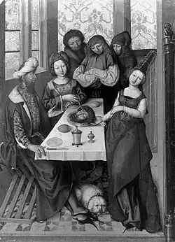 Das Gastmahl des Herodes, das in Berlin 1945 einem Brand zum Opfer fiel und nur noch in Schwarzweiss-Abbildungen überliefert ist, ist nach Ansicht des Kunsthauskonservators Christian Klemm und von Ulrich Gerster das früheste Werk des ersten Zürcher Nelkenmeisters. Es stellt die Szene dar, in der Salome von rechts her den Raum betritt und ihrer Mutter Herodias das Haupt des Johannes überreicht. Herodias traktiert das tote Haupt mit einem Messer. Das Motiv des Herodiasstichs findet sich in französischen Passionsspielen des frühen 15. Jahrhunderts. Barbara G. Lane wies am Beispiel des Johannesaltars von Rogier van der Weyden darauf hin, dass dieser Stich als präfigurative Vorwegnahme des Lanzenstichs gesehen werden kann, den der römische Hauptmann Longinus dem am Kreuz hängenden Christus versetzte.[5] Damit verweist das Gastmahl des Herodes direkt auf das Letzte Abendmahl hin.[6]