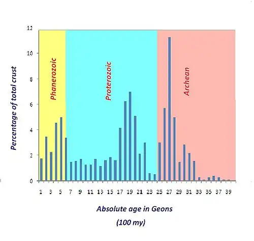Dieses enorme Krustenwachstum wurde von Taylor und McLennan (1985) auf rund 40 % des heutigen Krustenbestandes eingeschätzt. Ihnen zufolge soll sich die Erdkruste ausgehend von 30 % des heutigen Werts bei 2700 Millionen Jahren auf 70 % bei 2500 Millionen Jahren ausgedehnt haben.[5] Modellrechnungen zeigen, dass fast 100 % der kontinentalen Kruste bereits um 2500 Millionen Jahre oder schon etwas früher geformt worden war[6] – und sämtliches später erfolgende Anwachsen durch die Effekte Subduktion/Erosion ausbalanziert wurde.[7]