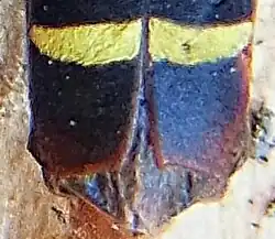 Die schmalen Flügeldecken verschmälern sich beim Männchen nach hinten deutlich, beim Weibchen kaum. Sie enden schräg abgeschnitten und sind an den Rändern des Abschnitts zugespitzt (Abb. 3). Sie sind mit Ausnahme der Basis und der Spitze angedunkelt. Ein Streifen an der Basis und drei schmale Querbinden der Flügeldecken erscheinen durch die Behaarung leuchtend gelb (Abb. 4).