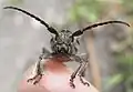 Der Kopf ist senkrecht zur Körperachse nach unten geneigt. Die Mundwerkzeuge zeigen nach unten. Das letzte Glied des Kieferntasters ist spindelförmig (Abb. 4, rechts rot). Im Unterschied zu den zahlreichen Arten der Gattung Dorcadion ist der Vorderrand des Kopfschildes (Abb. 4, rechts über der grünen Membran) nicht vorgezogen, er liegt mit der Basis der Mandibeln (Abb. 4, rechts gelb) in einer Ebene. Die elfgliedrigen Fühler erreichen etwa das letzte Drittel der Flügeldecken, die einzelnen Fühlerglieder sind am Ende knotig verdickt. Das dritte Fühlerglied ist kürzer als das erste (Abb. 2). Die nierenförmigen Facettenaugen umgreifen die Fühlerbasis von hinten. Auf dem Scheitel sind die Innenränder der Augen stärker einander genähert als die Innenränder der Fühlerbasen (Abb. 3 und Taxobild).
