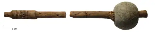 Ein besonderer Fund ist ein Keulenkopf mit erhaltenem Holzschaft. Dieser stammt aus der Uferzone, wodurch sich die Erhaltung erklärt. Der Keulenkopf gehört nicht der mittelneolithischen Besiedlung an. Er datiert ins mittlere bis späte Jungneolithikum (Einzelgrabkultur, Endneolithikum). Dies wurde aufgrund typologischer Vergleiche sowie einer 14C-Probe (2470–2341 calBC) ermittelt[1]. Der 28 cm lange Schaft besteht aus einem Eschenschössling (Fraxinus excelsior) und ist am Griff verstärkt und verziert (s. u.).