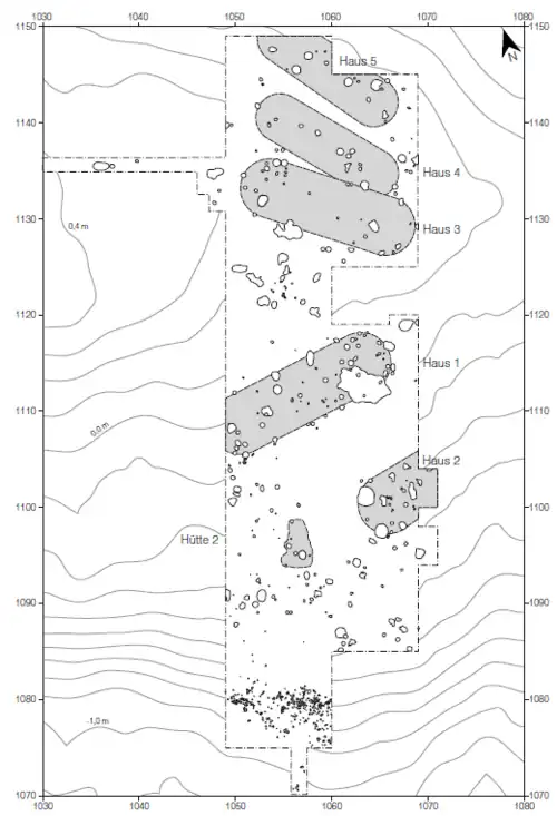 Der Grabungsschnitt Fläche 1 und 2 erbrachte sehr viele Pfostenspuren, anhand derer Hausbefunde zu rekonstruieren waren. Es wurden fünf Langhäuser und vier Hütten rekonstruiert und weitere drei Lagergruppen identifiziert.