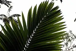 Die Blätter sind gefiedert und hinterlassen beim Abfallen eine glatte Narbe. Die Blattscheide reißt gegenüber dem Blattstiel auf und bildet keinen deutlichen Kronenschaft. Auf der Scheide sitzen zerstreut Schuppen, die Öffnung ist unregelmäßig faserig. Der Blattstiel ist abgeflacht oder an der Oberseite leicht gefurcht, an der Unterseite abgerundet. Er ist ebenfalls zerstreut mit Schuppen besetzt. Die Rhachis ist gebogen, an der Unterseite dicht gepunktet, an der Oberseite dicht flockig behaart. Die zahlreichen Fiederblättchen stehen regelmäßig, sind einfach gefaltet, zugespitzt und haben auffallend verdickte Blattränder. Die Oberseite ist kahl, die Unterseite ist nahe der Basis entlang der Mittelrippe etwas behaart.