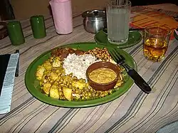 Dal-bhat-tarkari (दाल भात तरकारी) wird in ganz Nepal verzehrt. Bei Dal handelt es sich um eine aus Linsen und Gewürzen bestehende Suppe. Diese wird mit gekochtem Getreide, bhat – normalerweise Reis, manchmal jedoch auch anderem Getreide – mit Gemüsecurry, tarkari, serviert. Zu den Beilagen zählen unter anderem kleine Mengen extrem scharfen Chutneys (चटनी) oder südasiatische Pickles (achaar, अचार), welche frisch oder gegoren serviert werden können. Von diesem Gericht existieren unzählige Variationen, es wird von tausenden ausgegangen.[1] Andere Beilagen sind Zitronenscheiben (nibuwa) oder Limetten (kagati) mit frischem grünen Chili (hariyo khursani). Dhindo (ढिंडो) ist ein weiteres Traditionsgericht Nepals.