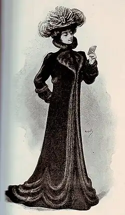 Der bürgerliche Kürschner auf der Kärntnerstraße der Stadt Wien, Joh. Menda, berechnete 1870 für „Ihre Durchlaucht der Frau regierenden Fürstin zu Schwarze“ unter anderem: „4 2/3 Ell. Nerzschweif-Verbrämung à 4,- fl. und diese Verbrämung mit Taffet besetzt“.[5] Fellreste werden üblicherweise nach Gewicht gehandelt, die Schweife bei entsprechender Nachfrage auch per Stück. In einem österreichischen Handelsbericht über das Geschäftsjahr 1892 wurde berichtet, das Nerzschweife in jenem Jahr einen sehr begehrten Artikel darstellten, der eine enorme Preissteigerung erfuhr, „so dass dieses unansehnliche Pelzstreifchen von 15 Centimter Länge und 2 Centimeter Breite mit 60 bis 70 kr. bezahlt wurde und nicht in genügender Menge aufzutreiben war“,[6] eine Entwicklung, die auch die folgenden Jahre anhielt.[7] Selbst aus Amerika, dem Hauptlieferanten der Nerzfelle, trafen nennenswerte Bestellungen am Pelzmarkt Leipzig ein.[8] Die Gründe für die Knappheit und den hohen Preis lassen sich an dem nebenstehend abgebildeten Mantel mit großzügiger Schweifgarnierung der Pariser Firma Revillon Frères, ausgestellt auf der Weltausstellung Paris 1900, erahnen. Gleichzeitig zeigte Revillon eine Decke aus 22.000 Nerzschweifen, „mit feinem Leder galloniert und mit der Maschiene genäht“. Die schöne und exakte Arbeit unter Verwendung der einige Jahre zuvor erfundenen Pelznähmaschine erregte „allseitige Bewunderung“.[9]