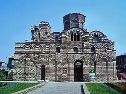 Größter mittelalterlicher Bau Nessebars und Beispiel der damaligen Architektur Bulgariens (siehe Bauschule von Tarnowo) ist die Johannes-Aleiturgetos-Kirche oberhalb von Meer und Hafen. Es handelt sich um eine Kreuzkuppelkirche aus der Mitte des 14. Jahrhunderts. Ihr polychromes Mauerwerk ist aus weißen Kalksteinquadern und rotem Backstein zusammengesetzt und mit reichen Keramikinkrustationen an den Bogenumrahmungen sowie in den Tympana und Dekorativpanneaus verziert. Sie werden durch plastische ornamentale und figurale Marmorreliefs ergänzt.[19]