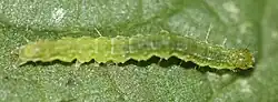 Erwachsene Raupen haben eine grünliche Färbung und sind mit einer dunklen Rückenlinie, weißlichen Nebenrückenlinien sowie weißgelben Seitenstreifen versehen. Aus den gelbgrünen Punktwarzen ragen einzelne Haare hervor. Die Segmenteinschnitte sind gelblich.
