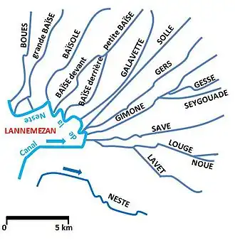 Bei Beyrède-Jumet-Camous wird vom Fluss Wasser abgezweigt und durch den Canal de la Neste über das Plateau von Lannemezan zur Bewässerung und Dotierung anderer Flüsse, die im Sommer wenig Wasser führen, weiter verteilt.