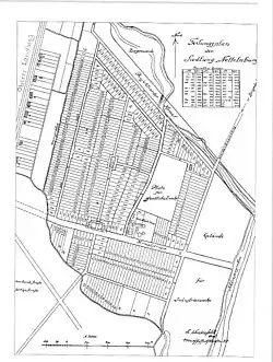 Charakteristisch waren die verklinkerten Einzel- oder Doppelhäuser mit Mansarden und Krüppelwalmdächern. Der Haupteingang war im heutzutage als erste Etage angesehenen Parterre, während die Wirtschafts- und Kellerräume wegen des hohen Grundwasserspiegels und der Überschwemmungsgefahr ebenerdig lagen.[4] Bei den meisten Häusern war ein Stall für Kleinvieh angebaut. Zu jedem Siedlungshaus gehörte ein großer Nutzgarten, der von Entwässerungsgräben begrenzt wurde. Bis August 1927 waren bereits 235 Häuser bezogen.[5]