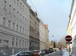 - Die Tautenhayngasse hat vor allem im Bereich der ungeraden 20er- und 30er-Nummern einen geschlossenen Verband spätsecessionistischer Zinshäuser auf. Der Geschwister-Hof (drei Häuser – Nr. 27, 29 und 31) ist aus dem Jahr 1912 von Adolf Slaby.[9] Der Name verweist auf die Beuherren, die das Miethaus als Investition errichteten. Das nicht mehr bestehende Haus Nr. 13 nimmt Achleitner als Beispiel, dass bei der Bebauung hier in innerstädtischen Dimensionen gedacht wurde.[9]