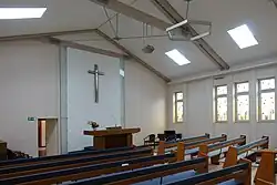 Das Satteldach der Saalkirche wurde komplett erneuert. Um die Raumluft zu verbessern, wurde die vorhandene Zwischendecke im Innern entfernt, so dass das Kirchenschiff nun bis zum Dachfirst hinauf reicht. Die massiven Balken und die Verstrebungen wurden als dekorative Elemente freigelassen. Indirekte Beleuchtung an den Dachschrägen und sechs Dachfenster, die sich elektrisch öffnen und bei Bedarf abdunkeln lassen, sorgen für viel Licht. Die dunkle Täfelung der Wände wurde hell lackiert. Neben der Sakristei gab es nur einen Mehrzweckraum. Im Obergeschoss über dem Vorraum wurde ein etwa 40 Quadratmeter großer Gemeinschaftsraum geschaffen, um die verschiedenen Kinder- und Musikgruppen unterzubringen. In die Nebenräume wird der Gottesdienst auf Flachbildschirme übertragen.[1]