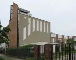 Der dritte Baukörper ist der rechtwinklig zum Haupthaus angeschlossene Anbau, der ausschließlich den Kirchenraum enthält. Dieser im Hof errichtete Gebäudeteil ist auf der gesamten Fassade dezent mit senkrechten weißen Putzspiegeln versehen, der jedoch keine Fensteröffnungen enthält.