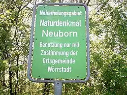 Der Neuborn liegt zwischen Wörrstadt und dem Stadtteil Rommersheim. An einigen Stellen hat man Aussicht auf den Wißberg (hier mit einer „Wißbergblick“ genannten Sitzbank), den Donnersberg und den Großen Feldberg. Der Neubornwald ist ein beliebtes Ausflugsziel und Naherholungsgebiet mit Springbrunnen, einem Biergarten und einer überdachten Tanzhalle. Der gesamte Park ist autofrei.[1] In der nahen Umgebung findet man das Neubornbad, ein Freibad mit Rutsche, sowie ein Sportgelände.[2] Dieses Sportzentrum am Neuborn wird auch von den ortsansässigen Sportvereinen genutzt und beherbergt zudem ein Restaurant.