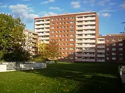 Das Deutschordens-Wohnstift Konrad Adenauer e. V. unterhält am Straßburger Platz ein Wohn- und Pflegeheim mit vier dem individuellen Pflegebedarf angepassten Wohnkomplexen. Den rund 350 Bewohnern wird eine integrierte gerontopsychiatrische Betreuung angeboten. Neben den üblichen Pflegeeinrichtungen stehen den Bewohnern ein Thermalbad und eine Gebetskapelle zur Verfügung.[30] Der Grundstein für das Hauptgebäude des Wohnstiftes wurde am 7. September 1974 durch Kardinal Joseph Frings gelegt; die Einweihungsfeier fand am 31. Januar 1976 statt.[3]
