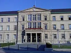 Die Dreigeschossigkeit des Gebäudes wird durch Gurtgesims an der Fassade betont. Der Mittelrisalit ist wie die beiden Seitenrisalite circa einen Meter nach vorne versetzt. Er wird von einem Satteldach bedeckt. Das Hauptportal liegt auf einem fünf Treppenstufen hohen Stereobat. Diese Erhöhung setzt sich am restlichen Gebäude durch einen Sockel fort, der mit einem Sockelgesims an der gesamten Fassade abschließt. Das Hauptportal an der Wilhelmstraße besteht aus drei Türen, der doppelflügeligen Mitteltür und zwei einflügeligen Seitentüren. Vor dem Haupteingang befindet sich ein Altan. Sein Austritt wird von vier unkannelierten toskanischen Säulen getragen.