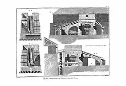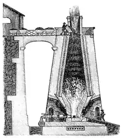 „Wie beim Stückofen hatte der Blauofen eine geschlossene Brust (Brust nannte man die Abstichseite). Sie war am Abstich mit Lehm vermauert und konnte dort mit einer lanzenförmigen Stange aufgebrochen werden. Der beim Stückofen noch viereckige Schacht hatte jetzt die Form zweier abgestumpfter, mit der Spitze sich berührender Pyramiden, aus denen sich später die Form zweier abgestumpfter Kegel entwickelte. Der metallurgische Vorgang beim Schmelzen war derselbe wie beim Stückofenbetrieb. Obwohl im Blauofen schmiedbares Eisen gewonnen wurde, war es indessen von so ungleicher Beschaffenheit, daß es noch einmal im Herdfeuer ausgeheizt werden musste. Das Ausheizen geschah im Löschfeuer, einer gemauerten, mit Kohlenlösche versehenen Grube, die mit einem Gebläse verbunden war.“[6]