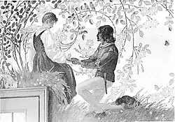 Im Vorraum befand sich das Wandgemälde „Werbung im Rosenhag“[16]. Eine „anheimelnde zarte Stimmung“[16] ging von diesem Gemälde aus. Ein „anmutiger Rosenfries“[16] zog sich die Wand entlang, darüber „husch[t]en Schmetterlinge hin und beleb[t]en das fein abgetönte Graugrün des Wandgrundes.“[16]