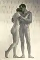 Das Wandgemälde im Trauzimmer in Kobaltblau verbreitete im Gegensatz dazu eine tragische Stimmung. Ein nacktes Paar stand hier im Mittelpunkt, sie an den Mann gepresst, der sie schützend umarmte. Die Farben reichten von „duftigen und diskreten Fleischtönen“[16] zum „mattem Gold“[16] bis hin zum Blutrot: