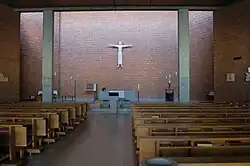 Auch das betont schlicht gehaltene Innere der Kirche ist dominiert von unverputztem Klinkermauerwerk sowie Pfeilern aus Sichtbeton.