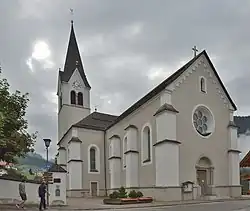 Die in historisierenden Formen errichtete Kirche ist ein Langhausbau mit einem Querschiff. Der Kirchturm ist im Norden seitlich angebaut. Das Portal ist wie zahlreiche andere Details neuromanisch gestaltet, in die Langhaus- und Querschiffmauern sind Rundbogenfenster eingesetzt. Das Langhaus ist durch drei Joche gegliedert, das Querschiff durch je zwei. Die Decken von Langhaus und Chor haben Stichkappengewölbe. Die nazarenisch komponierten Wandgemälde an der Langhausdecke, in der Vierung, in den Querschiffarmen und im Chor stammen vom Innsbrucker Max Gehri aus den 1890er-Jahren. Eine Besonderheit der Kirchenausstattung sind die barocken Holzskulpturen von Dominikus Moling; zu diesen zählen der Heilige Johannes Nepomuk auf Wolken schwebend, ein schwebender Engel an der Kanzel und eine auf Wolken stehende Madonna.