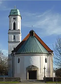 Südlich an den Chor grenzt die Sakristei. Gedeckt mit einem Mansarddach und mit einem Türmchen mit Zwiebelhaube als Treppenaufgang bietet sie einen malerisch-romantischen Eindruck im Sinne des Heimatstils und ist deutlich vom übrigen Gebäude abgehoben. An der Nordseite des Chores steht der viereckige Turm. Er ist reich gegliedert, im oberen Teil mit zum Achteck angeschrägten Ecken, und trägt ein zweifach gestuftes kupfernes Glockendach. An die Sakristei schließt sich das Pfarrheim an und bildet einen Übergang zum Pfarrhaus. Das Pfarrhaus von Friedrich Haindl aus dem Jahr 1928 ist im zurückhaltenden Heimatstil dem Kirchenbau angepasst, während das Pfarrheim von Otto Steidle im modernen Baustil der 1970er Jahre stark zu den übrigen Bauten kontrastiert.
