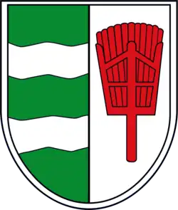 Blasonierung: „Gespalten; vorn: in Grün zwei silberne Wellenbalken; hinten: in Silber ein roter Feuerbesen.“[28] |