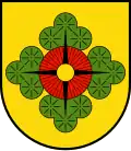 Das Wappen zeigt eine schematisierte Darstellung der Luftansicht des Ortes. Das schwarze Kreuz mit dem gelben Kreis symbolisiert das Dorfzentrum mit der Kirche, die roten Flächen die Häuser, die grünen Elemente stehen für den Waldreichtum des Gegend und der gelbe Untergrund ist das Zeichen für die Landwirtschaft. Das Wappen wurde 1974 formlos eingeführt.[6]