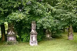 „In der Rococoperiode ein Felspostament, sarkophagartigen Unterbau, Obelisk mit Inschriftkartuschen, Bekrönung mit Halbgiebeln, Voluten, Putten u. A. Das Ganze als Platte, nur auf der Vorderseite bearbeitet. […] In der Zeit des Klassicismus quadratischen Unterbau, cannelirte Säule mit Medaillons und Guirlanden bekränzt, darauf eine Vase oder Urne, mit Blumengewinden oder Tüchern geziert.“