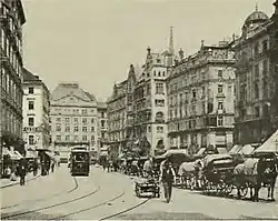 Das Hotel Ambassador (ursprünglicher Name: Hotel Krantz, danach: Krantz-Ambassador, nach dem Gründer Josef Krantz, eröffnet 1898) am Neuen Markt 5 wurde 1897 nach Entwürfen der Architekten Kupka und Orglmeister errichtet. An dieser Stelle befand sich im Mittelalter das städtische Mehldepot, die sogenannte Mehlgrube.[3] Das Hotel hat auch noch einen Eingang von der Kärntner Straße (Nummer 22).