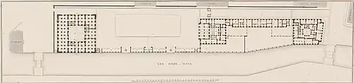 - Das Wohngebäude für den Packhofdirektor und seine Mitarbeiter. Dieses Haus war ebenfalls von fast quadratischer Grundform, verfügte wiederum über einen kleinen inneren Hof und enthielt außer den Wohnungen auch den großen Revisionssaal und die Räume der Packhofverwaltung, bis auf diejenigen, die sich in dem langen Verbindungsgebäude befanden.
