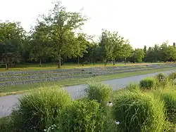 Ebenfalls rasterartig angelegt ist die Bepflanzung des Parks mit Einzelbäumen, deren Abstände zueinander sich nach Norden, in Richtung des Wohnviertels verringern.[5] Der Baumbestand des vormaligen Parkplatzes wurde übernommen.[7] Auf die Anpflanzung von Unterholz (Büsche und Sträucher) wurde weitestgehend verzichtet, lediglich der südliche Rand der Grünanlage wird von dichterem Gehölz von den benachbarten Messeparkhäusern abgeschirmt. Entlang der Parkwege sind vereinzelt pflegeleichte Präriestauden gruppiert,[3] ein Pilotprojekt des Grünflächenamtes der Stadt Frankfurt, „Stauden im öffentlichen Grün“[5] (→ Staude).