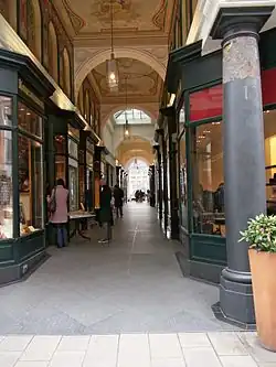 - 11+ 13: 1845, Entwurf Alexis de Chateauneuf, Umbau 1880er Jahre. Die Mellinpassage (Nr. 13) schafft einen Durchgang zu den Alsterarkaden. Beide Häuser wurden an Silvester 1989 weitgehend durch ein Feuer zerstört,[23] der Bereich am Neuen Wall ist jedoch erhalten geblieben. Bei Restaurierungsvorarbeiten wurden Jugendstil-Werbetafeln an den oberen Wandteilen und eine entsprechende Deckenbemalung freigelegt. Das Geschäft des etablierten Herrenausstatters «Ladage & Oelke», Lieferant des klassischen Hamburger Dufflecoats, war seit der Errichtung des Hauses Nr. 11 im Jahr 1845 bis 2019[24] in denselben Räumen untergebracht, abgesehen von einer kurzen Unterbrechung nach dem Brand 1989.[25] In Nr. 13 befindet sich seit 1948 das Ladengeschäft der renommierten Buchhandlung «Felix Jud», die sich über drei Etagen hinzieht.