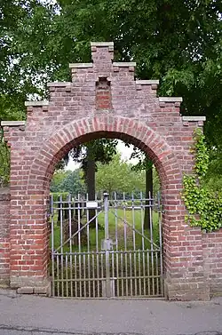 Der Friedhof wird von einer Mauer aus Backsteinen umfriedet. Der Eingang besteht aus einem abgetreppten Bogenportal.