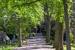 Am oberen Ende steht die historische Trauerhalle als Betraum für Trauerfeiern und Taharahaus.[4] Die Halle wurde von dem Architekten Hugo Hirsch geplant und als funktionsgerechter Backsteinbau im orientalischen Stil mit neoklassizistischen Elementen ausgeführt.[2] Das Gebäude mit Vorbau mit Rundbogen-Arkade, Säulen aus thüringischem Sandstein sowie Fensterrosetten mit Davidstern an Nord- und Südseite der Kuppel wurde 1894 eingeweiht.[1][6]