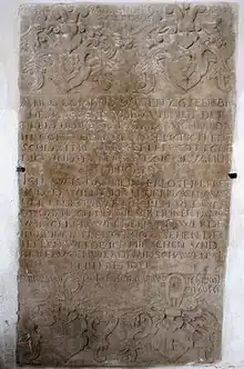 ANNO DOMINI 1599 DEN 26 FEBRUARÏ DES MORGENS VMB 2 VHR IST DER EDLER EHRNVESTER CASPAR VON RANDOW IN GOTT DEN HERN SELIGLICH ENT SCHLAFFEN DER SEELEN GOTT GNE DIG VND BARMHERTZIG SEY AMEN HIOB 19 ICH WEIS DAS MEIN ERLOSER LEBET UND ER WIRDT MICH HERNACH AVS DER ERDEN AUFFWECKEN UND WER DE DARNACH MIT DIESER MEINER HAVT VMBGEBEN WERDEN VND WERDE IN MEINEN FLEISCH GOT SEHEN DEN SELBEN WERDE ICH MIR SEHEN VND MEINE AVGEN IN SCHAWEN VND KEIN FREMDER |