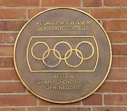 Seit 2006 befindet sich auf dem Gehweg vor dem Rathaus entlang der Berliner Straße der „Weg des Ruhmes“.[7] Dort sind Plaketten mit den Namen der aus Cottbus stammenden Gewinner olympischer Medaillen in den Gehweg eingelassen, die Farbe der Plaketten repräsentiert die jeweils gewonnene Medaille. Der Weg des Ruhmes wurde nach einer Idee der Deutschen Olympischen Gesellschaft Cottbus/Spree-Neiße angelegt und wird mit der Zeit erweitert. Seit November 2024 umfasst der Weg des Ruhmes 76 Plaketten.[8]