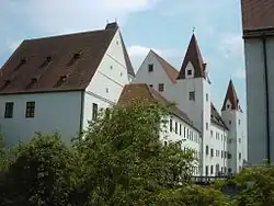 Nach Aussterben der Linie Bayern-Ingolstadt fiel der Landesteil 1450 an das Herzogtum Bayern-Landshut. Unter Ludwig dem Reichen wurde um 1470 bis 1473 der Getreidespeicher (später: Zeughaus) auf der Nordseite errichtet.[5] An der Nordwestecke ist ein Rundturm in den Bau einbezogen. Gleichzeitig wurde die Befestigung des Neuen Schlosses ausgebaut. Der Graben um die Anlage wurde ausgehoben und eine Bastei zur Donau hin errichtet.