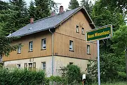 Im Bereich des vom Riedertberg (775 m ü. NN) geprägten Waldgebietes zwischen Eibenstock, Zwickauer Mulde und der Wilzsch wurde schon um 1500 ertragreicher Zinnbergbau betrieben. In einer Bildkarte der Bergwerke Vordere und Hintere Schmochau wird eine Reihe von Bergwerksanlagen und Pochwerken genannt.[9] Wieweit auch der Bereich der heutigen Siedlung Neues Wiesenhaus in den Bergbau einbezogen war, ist nicht erkennbar. Das 1791 von Friedrich Ludwig Aster gezeichnete Blatt 220 der sächsischen Meilenblätter – Berliner Ausgabe – zeigt noch keine Bauten an dieser Stelle.[10] In der mit „Ergänzungen bis in das letzte Viertel des 19. Jahrhunderts“ versehenen Dresdner Ausgabe findet sich der Eintrag Wiesenhaus.[11] Im Neuen Wiesenhaus gab es „eine der letzten Pechhütten des Gebirges“.[12] Die Technik, aus Baumharz durch Kochen Pech herzustellen, wurde mit dem Ende des 19. Jahrhunderts nicht mehr angewandt.[12] Es ist zu vermuten, dass in der zweiten Hälfte des 19. Jahrhunderts eine Gaststätte und das Forsthaus, die beiden einzigen Gebäude der Siedlung, entstanden. Für das Forsthaus lässt die erste Datierung der Bauakte des Landbauamts Zwickau mit dem Jahr 1862 diesen Schluss zu.[13] Die Gaststätte wird erstmals 1884 in den Akten des gleichen Amts erwähnt.[14] Auf Ansichtskarten aus der Zeit um 1910 steht am Gebäude der Gastwirtschaft „Restaurant Wiesenhaus“. Bei der Planung des Weiterbaus der Schmalspurbahn Wilkau-Haßlau–Carlsfeld von Wilzschhaus nach Carlsfeld am Ende des 19. Jahrhunderts werden sie schon vorhanden gewesen sein. Sonst wäre angesichts des geringen Abstands zwischen Wilzschhaus und Wilzschmühle von lediglich 3,615 Kilometern eine Bedarfshaltestelle der Bahn nach nur 1,932 Kilometern nicht eingerichtet worden. Die Bahnstrecke verlief zwischen Straße und Wilzsch. Der Haltepunkt hatte keinerlei Bauten, nur ein Stationsschild. Reste der Bahn sind nicht mehr vorhanden. Der Haltepunkt der Eisenbahn wurde unter der Bezeichnung „Wiesenhaus“ geführt.[15]