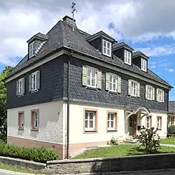 - Haus Nr. 11: Eingeschossiger Wohnstallbau mit Satteldach, 18. Jahrhundert, verschieferter Blockbau bis auf einen mit Sandsteinquadern ausgemauerten rückwärtigen Teil. Unter dem Giebel Gesims mit Konsolfries, auf der Hofseite profilierte Balkenköpfe.[29]