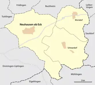 Zur Gemeinde Neuhausen ob Eck mit den früher selbstständigen Gemeinden Schwandorf und Worndorf gehören insgesamt 15 Dörfer, Weiler, Höfe und Häuser. Zur Gemeinde Neuhausen ob Eck in den Grenzen vom 31. Dezember 1972 gehören das Dorf Neuhausen ob Eck und der Weiler Breitenfeld. Zur ehemaligen Gemeinde Schwandorf gehören die Dörfer Holzach, Oberschwandorf, Unterschwandorf und Volkertsweiler und die Höfe Göningerhöfe, Hattelmühle und Ilgental. Zur ehemaligen Gemeinde Worndorf gehören das Dorf Worndorf, die Weiler Danningen und Tannenbrunn, die Höfe Rößlerhof und Streckerhöfe und das Haus Wasenhof.