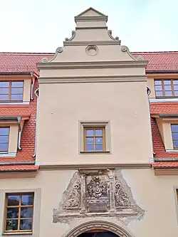 Über dem Portal wurde eine prunkvolles Wappenfeld aus Sandstein angebracht. Ornamentierte Pilaster und Gesimse rahmen das Wappen der Stadt Halle ein, das von zwei Putten gehalten wird. Unter dem Wappen befindet sich ein erhabenes Schriftfeld mit einer Inschrift. Seitlich der Pilaster sind zwei kleine Sockel mit Delphinen und Blattornamenten, unter denen zwei weitere zweizeilige Inschriften verlaufen. Die Inschrift links ist verloren gegangen, die rechte ist stark beschädigt.